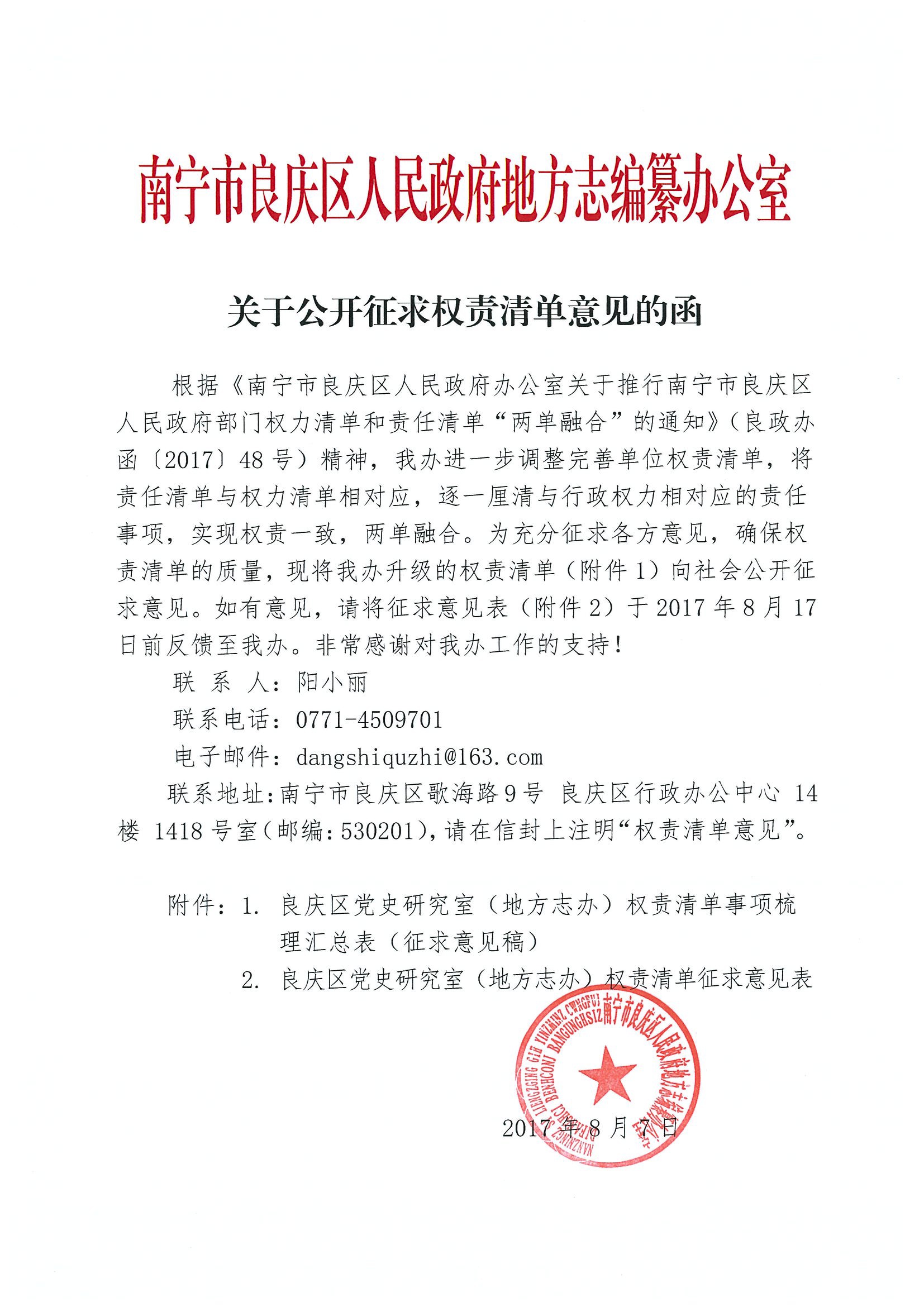 良庆区地方志办关于公开征求权责清单意见的函(已过期)